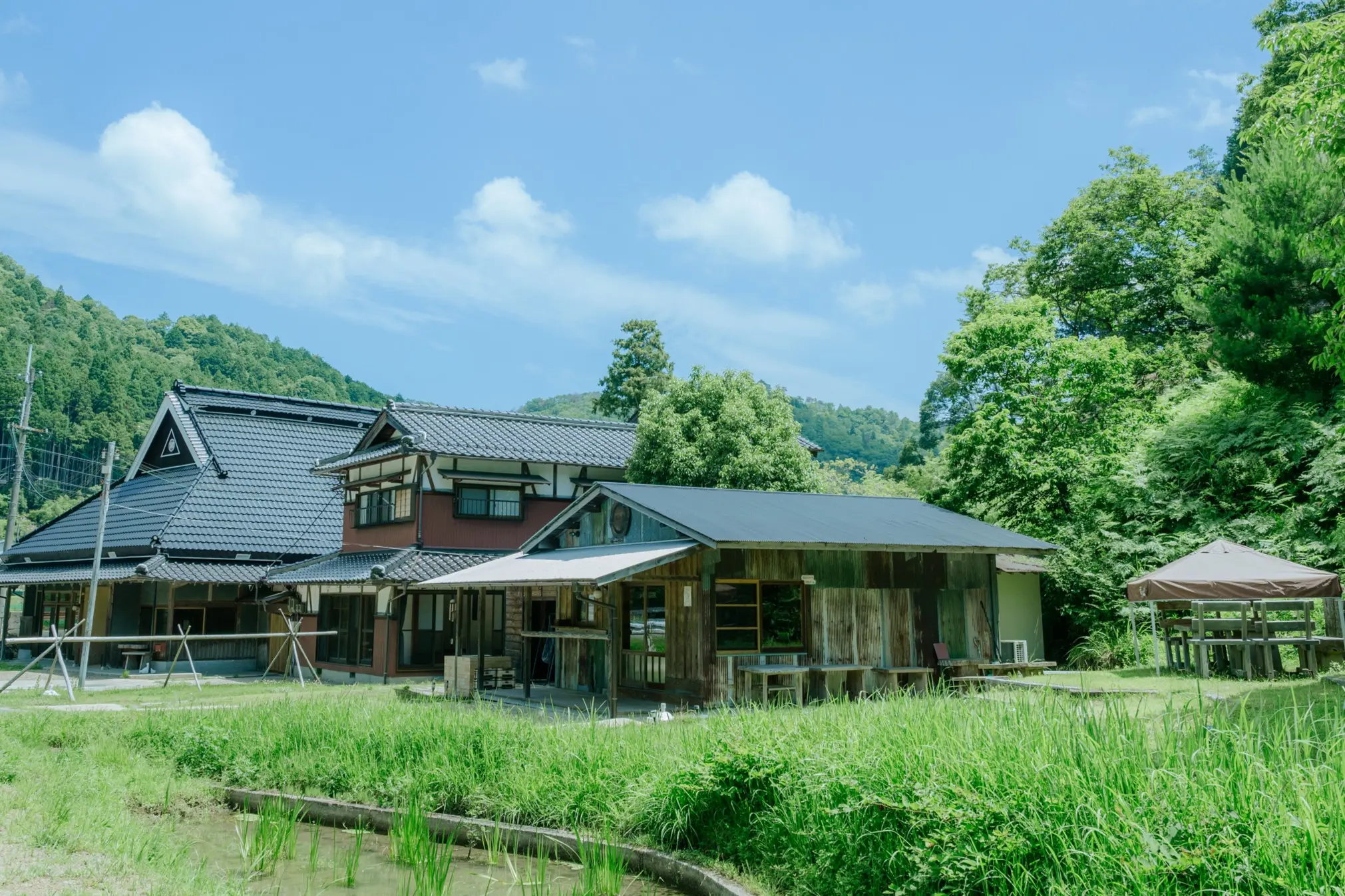 五感でわくわくできる、山里暮らし体験施設。茅葺の農家を改修した宿、その裏の山にはキャンプエリア、農業体験ができる畑やカフェレストランもあります。